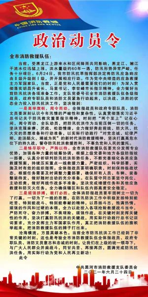 建立战时宣传鼓动队。支队坚持做到“战斗任务在哪里,政治工作就延伸到哪里”的原则,带齐备足战时政治工作设备,实现了党旗、队旗、战旗在战斗一线高高飘扬。通过开展“一两分钟宣誓”、“三五句话动员”,悬挂标语、编发口号、定时播放战歌等形式,确保队伍士气不松、战斗力不减。积极联系对接主流媒体,《新闻直播间》《朝闻天下》《极光新闻》《黑河新闻》等中央、省、市媒体先后报道刊发支队防汛抗洪新闻。发布抖音、快手短视频8条,消防救援队伍的优良作风和战斗精神得到百姓一致赞誉。