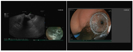 手术如期进行,由消化内科徐洪雨教授与李冬月副教授领衔的超声内镜团队主导手术,同时联合腔镜室全体护理人员及麻醉科团队开展紧密协作。手术中,团队通过线阵超声内镜的精准引导,成功为患者完成经胃壁LAMS对吻支架放置,胃肠吻合术顺利落地!术后,患者因十二指肠狭窄引发的梗阻问题得到了有效解决,恢复了正常进食饮水。