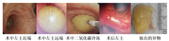 面对挑战,于世寰主任带领呼吸介入团队迅速联动麻醉科刘淑杰主任医师,针对患者病情展开紧急会诊,制定了周密的救治方案及预防意外的预案。张春玲副主任医师在刘淑杰主任医师的全麻保障及吴昊岚副主任护师的密切配合下,开始进行异物取出术。术中发现,“菇茑”已完全嵌顿于患者左主支气管远端,因异物体积较大,表面光滑,镜下网兜无法完全抓取。团队当机立断,先用二氧化碳冷冻细探头插入异物内部,将其松动拉出,再换用二氧化碳冷冻粗探头冷冻黏住,成功将“菇茑”完整取出。异物取出后,见左肺上下叶支气管内被大量粘稠分泌物堵塞,阻塞的痰液利用电子支气管顺利排出后,患者血氧饱和度即刻升至96%,呼吸功能迅速恢复。