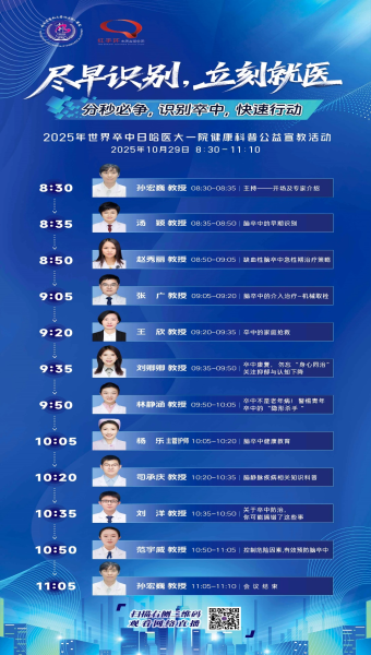 2025年10月29日是第20个世界卒中日,今年的口号是“尽早识别、立刻就医”,强调早发现、早诊治的重要性。卒中的早期识别工具:“BE FAST”口诀,B-Balance,难平衡;E-Eyes,看不清;F-Face,脸不正;A-Arms,臂不平;S-Speech,语不灵;T-Time,发现以上症状请立即拨打120!时间就是大脑,时间就是生命,只有尽早识别、立刻就医才能降低脑部的损伤。