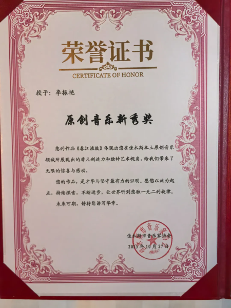 中新网黑龙江新闻11月3日电(赵勇涵 杨晓宇)佳音传东极,黑土谱新篇。在10月27日举行的“东极飞歌·祝福祖国”——第二届“歌声里的佳木斯”原创歌会暨全国歌词征集大赛颁奖仪式上,抚远市市级非遗代表性传承人李振艳带领团队荣获大赛——原创音乐新秀奖!