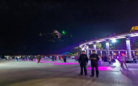 为提升中央大街、防洪纪念塔等景区景点巡逻防控效能,道里分局全力构建“无人机+警务”模式,将无人机场景应用作为核心战斗力“倍增器”。通过专项装备投入、专业人才培养规划,搭建起装备先进的警航工作体系,充分发挥无人机视野广、覆盖全、速度快、效率高的优势,着力打造立体化治安防控网络。在景区景点等重点区域,无人机开展高频次、大密度空中巡逻,实时监测区域内人流量变化,精准捕捉异常情况,为地面警力部署、风险预警提供科学决策依据。同时,创新采用“显性+隐性”协同巡逻模式,无人机空中巡航与巡逻队地面巡查无缝配合,既提高了见警率,又提高了应急处置率,凸显了“空中引导、地面合围”快速响应机制的优势。