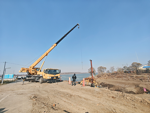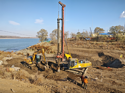 在音达木河跨线桥项目建设现场,工人们正利用打桩设备进行桥桩基础施工,按设计点位精准打孔,之后将灌注混凝土形成16根桥桩,为后续构建桥梁承台奠定基础。