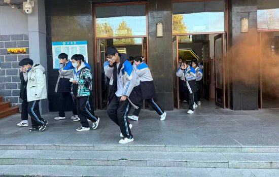 9时40分,一阵急促的消防警报响彻校园,演练正式拉开序幕。与此同时,校园教学楼西侧指定区域释放烟雾弹,模拟真实火灾中浓烟弥漫、能见度不足3米的紧急场景,瞬间营造出紧张的实战氛围。听到警报后,各班级学生反应迅速,在教师的指挥下,迅速取出课前准备的湿毛巾捂住口鼻,弯腰低姿沿着墙壁向楼梯口移动。各楼层引导教师坚守楼梯转角、走廊岔口等关键位置,一边疏导人流,一边提醒“保持间距、不推挤”。从警报响起至最后一名学生抵达操场集合点,全程仅用9分42秒,千余名学生全部安全撤离,无一人遗漏。