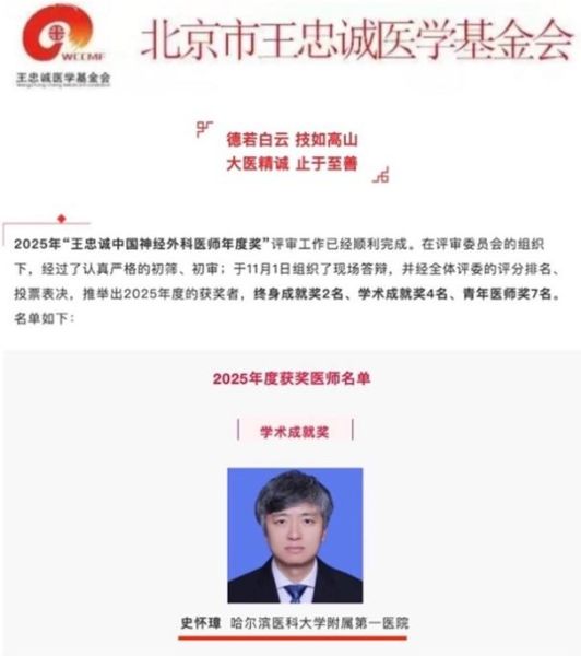 “王忠诚中国神经外科医师年度奖”是由中国医师协会神经外科分会和北京市王忠诚医学基金会联合创立,以中国神经外科奠基人王忠诚院士命名,旨在表彰对中国神经外科事业作出突出贡献的医师,是中国神经外科领域最高级别的个人荣誉奖。史怀璋教授获“王忠诚学术成就奖”,展现了哈医大一院神经外科在全国的影响力。(完)