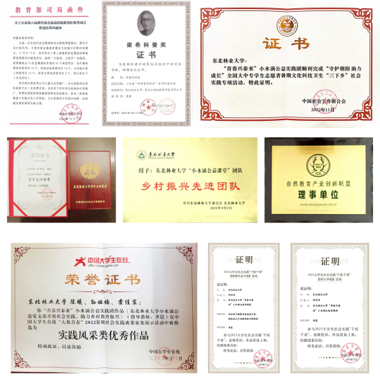 众多荣誉,是团队服务社会的最好证明。项目获评中国大学生在线实践风采类优秀作品、“守护朝阳,助力成长”三下乡社会实践百所优秀高校团队、大学生社会实践“千校千项”项目优秀和视频优秀、教育部直属高校精准帮扶典型项目、梁希科普奖等,以团队为基础建立的党支部成为东北林业大学首个获得全国党建工作样板支部的学生支部,项目案例在教育部网站发布并推广……