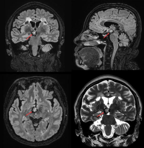 患者王女士(化姓),今年51岁,因间断性头部胀痛前来就诊。经头部磁共振(MRI)检查,发现其右侧下丘脑、脑干区混杂信号,考虑海绵状血管瘤伴出血。孙家行教授介绍,下丘脑是大脑中的“核心中枢”,负责调节意识、内分泌、体温及感觉传导,周围密布着重要的神经纤维和核团。此处的病变传统开颅手术路径极长,损伤风险巨大,犹如“雷区排爆”,稍有不慎就可能导致患者昏迷、内分泌紊乱、感觉丧失、运动障碍等严重并发症,因此一直是神经外科领域难度最高的手术之一。