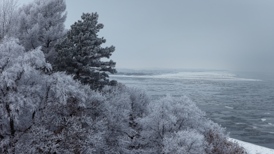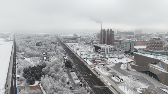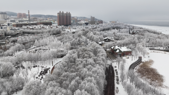 雾霭漫入城区,街巷便成了霜雪的秘境。路边的枝桠皆覆着一层莹白的雾凇,似梨花漫落,如琼屑堆积。砖瓦与冰凇相映,冷白中透着温润,整座城没有繁复的色彩,只有素白勾勒轮廓,宛如水墨长卷中最清丽的一笔。