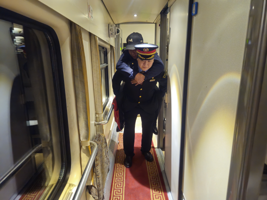 这款便携轮椅折叠后占行李箱大小的空间,仅需20余秒就能安装完毕,展开后宽度约45厘米,能轻松穿梭于车厢走廊直达旅客包房,解决了车站大型轮椅无法进入车厢的难题。月初的一趟乘务中,一位乘坐轮椅的残疾旅客因车厢拥挤,无法自行进入包房。郜俊龙与乘务员默契配合,熟练地展开、调试折叠轮椅,稳稳地将老人扶上座椅,并帮忙搬运行李,短短3分钟内便将旅客舒适地“转移”至铺位。