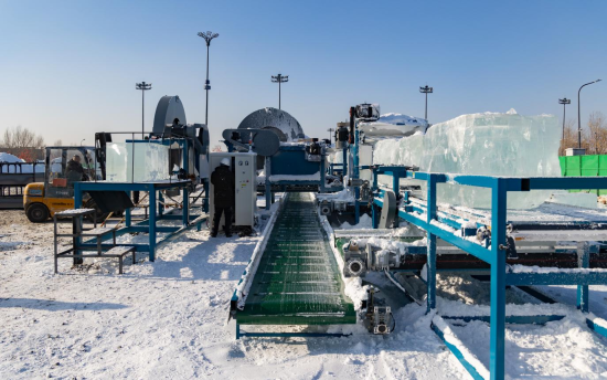 中新网黑龙江新闻12月9日电(郑蓥卓)在所有冰雪人的共同努力下,哈尔滨冰雪大世界的冰雪景观建设已进入冲刺阶段。与往年不同的是,今冬的工地上迎来了两位特殊的“新员工”——智能自动化标准冰砌块生产设备,它们正开足马力,将毛冰快速、精确地切割成平整光滑的标准冰砌块。