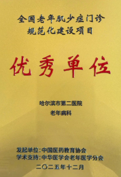 此次获评既是对医院在老年肌少症诊疗领域既往工作的认可,更是对未来学科发展的激励与鞭策。哈尔滨市第二医院老年病科将持续深化临床诊疗实践,进一步加强科学普及与健康教育,助力提升区域老年肌少症防治的整体水平,为更多老年肌少症患者带来福音。