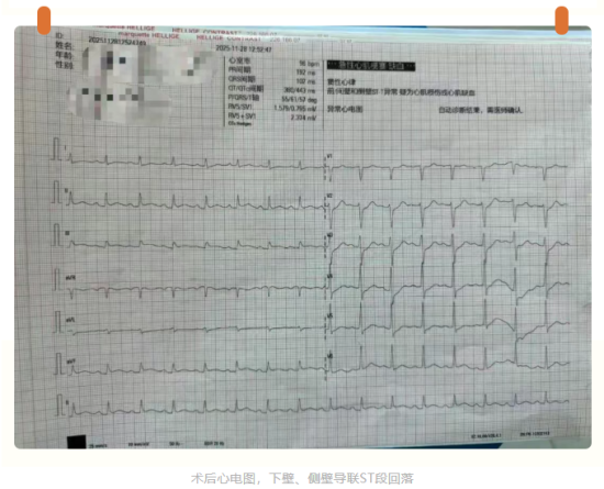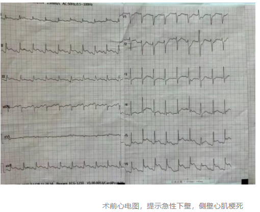 到达哈尔滨市第二医院急诊科后,患者意识逐渐恢复,但呈现脑乏氧、反应迟钝及轻微烦躁。急诊科医护人员立即给予患者吸氧、监护、补液。此时心电图检查提示为急性下壁、侧壁心肌梗死。由于患者情况紧急,急诊科张瑞主任一边组织抢救,一边邀请心血管内一科张国华主任前来会诊。