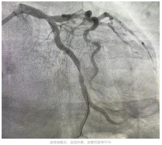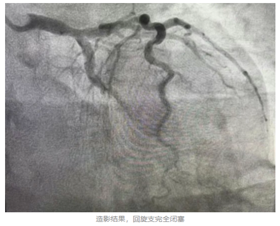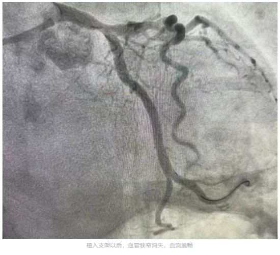 心血管内一科主任张国华到场后,结合患者心电图报告、临床症状及既往心脏病史,迅速诊断其为急性心肌梗死,并指导立即给予口服药物,建议其进行急诊冠脉造影检查及介入治疗开通血管。心血管内科介入团队迅速为李先生进行冠脉造影检查。检查结果显示,患者左冠状动脉回旋支完全闭塞,随时可能危及生命。经过血栓抽吸后血管开通,但病变处狭窄仍为95%。随后心血管内一科介入团队又为患者植入1枚支架。支架植入后患者病变狭窄完全消失,血流通畅,胸痛消失,意识状态恢复。