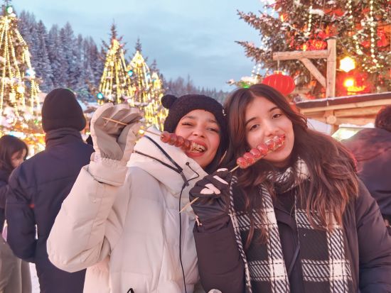 研学乐趣,就藏在深度互动里。热闹的年货大集,是雪乡烟火气的生动写照。大家被喜庆的花棉袄元素所吸引,穿梭挂满红灯笼的街巷,好奇地品尝冻梨、挑选福字,沉浸中国年的喜庆氛围里流连忘返。走进温暖的东北农家院,有模有样盘腿上炕,认真包起饺子,那份专注投入,饱含对中国“家”文化的亲近向往。
