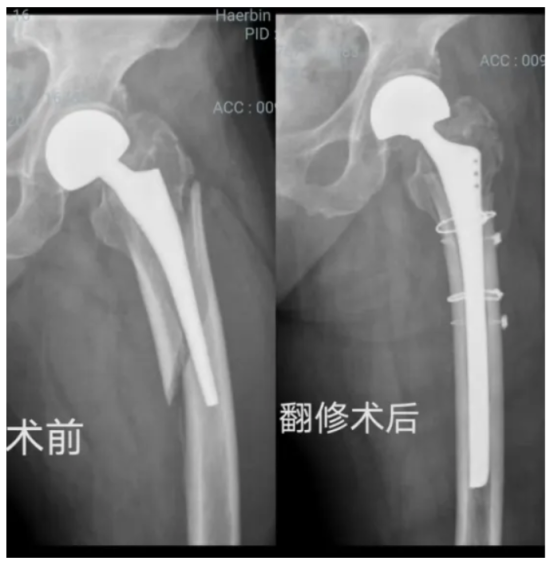 经过充分的术前准备后,手术正式开始。骨外一科返聘专家李德怀、副主任孙志海带领的专家团队紧密配合,为患者精准拆除了原假体,清除界面纤维组织,植入加长翻修柄,并用钛缆进行加固,重建了髋关节的稳定性。历时2.5小时,手术顺利完成。术中出血量控制在400ml以内,患者生命体征始终保持平稳。