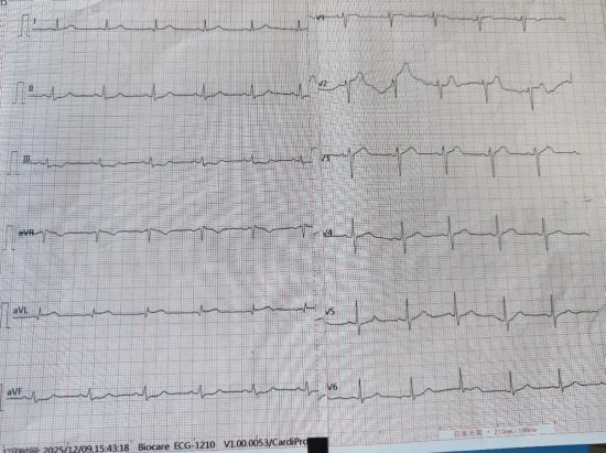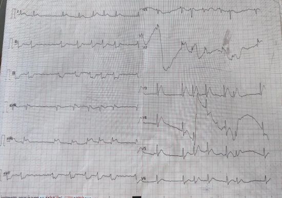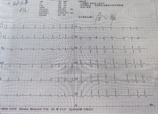 患者入院心电检查:高侧壁ST段轻度上斜型改变,下壁ST段轻度下移