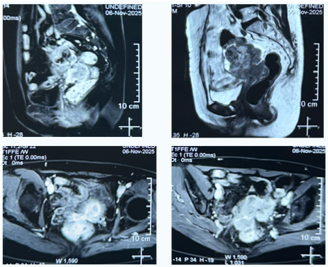 62岁的李女士(化名),既往有宫颈癌、乙状结肠癌手术史,最近出现了血尿的症状,在家人的陪同下来到哈医大一院群力院区就诊。经进一步检查发现,李女士盆腔内存在一约8.1×6.6cm的囊实性占位,肿瘤侵犯膀胱后壁、直肠、部分回肠、乙状结肠、左侧输尿管及阴道断端,并伴有左侧输尿管扩张及盆腔淋巴结肿大,病情极为复杂。