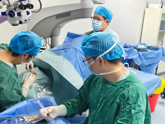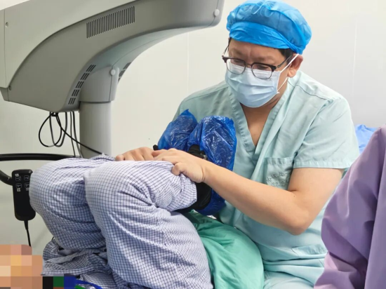 要保证患者在术中“仰卧”且头部固定,这对医生的体力、耐力及手术稳定度都是极大的考验。面对这一挑战,眼科五病房赵秀梅教授和施展副教授迅速组织全科进行深入讨论,并联合手术室护士团队进行了术前评估。经过反复模拟,团队最终为患者“量身定制”了一套个性化手术方案。赵秀梅教授作为主刀医生完成此例手术,施展副教授则始终抱住患者双腿来固定她的手术姿势。在白内障超声乳化手术室护士的紧密配合下,整个团队以高度的专注与协作,最终成功完成了这例高难度手术。