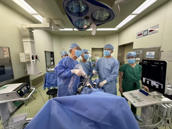 哈医大二院普通外科七病房陈晓宁教授(左1)带领团队联合住院处超声科医师完成术中超声联合荧光引导的腹腔镜下肝Ⅴ、Ⅷ段切除术
