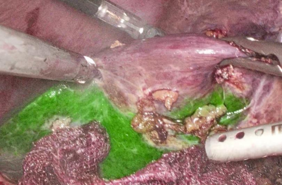 陈晓宁教授介绍,患者75岁高龄且合并糖尿病、病灶位置深在,无法耐受开腹手术与大范围的肝切除,必须进行精准定位,精准切除,实现“根治性切除与功能保护”的平衡。而术中超声是腹腔镜肝切除的“眼睛”,可通过腹腔镜超声探头实时指引切除路径,明确切除病灶与毗邻血管的关系,特别适用于深部肿瘤的精准定位。而ICG荧光染色技术通过将吲哚菁绿注入患者体内,利用其在肝细胞代谢的特异性,可将肝肿瘤与目标肝组织进行染色区分。术中超声与ICG荧光染色的联合应用,极大地提高了手术的精准度和安全性,是该患者的最佳手术方案。