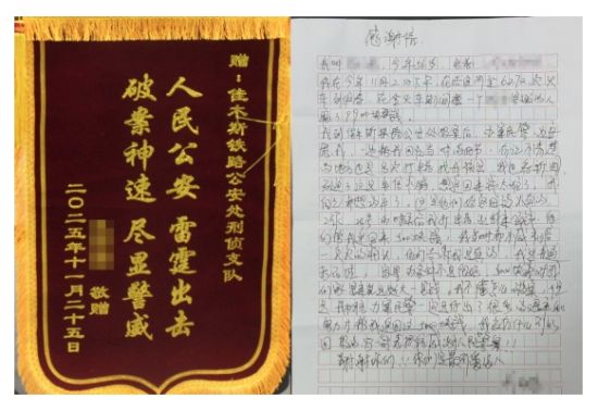 中新网黑龙江新闻12月17日电(韩昊轩)近日,旅客武女士拿着锦旗和感谢信找到佳木斯铁路公安处刑事侦查支队,向连日来全力帮她挽回损失的民警表达感激。