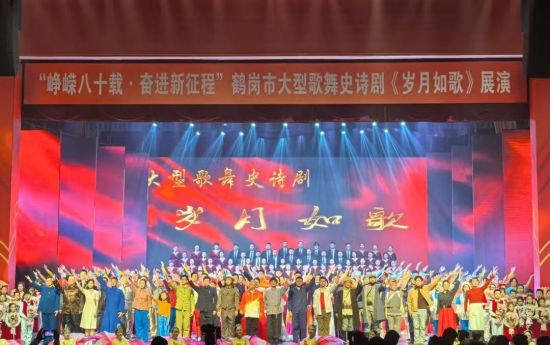 鹤岗市人民剧院内,灯光璀璨,座无虚席,大型歌舞史诗剧《岁月如歌》正在精彩展演。舞台上,演员们身姿舒展、舞步铿锵,时而深情演绎岁月温情,时而激昂再现奋斗热潮。这部总时长约100分钟、参演人员达400余人的剧目,融合歌舞、情景剧、小品和多媒体等多元艺术形式,用20个特色节目串联起鹤岗人民抗击日寇、支援解放、建设边疆到高质量转型的百年征程。从《英雄的足迹》诠释抗联精神,到《咱们工人有力量》再现建设热潮,再到《向前奔跑》呈现转型活力,剧中既有《龙江三峡》绸吊高难特技的震撼呈现,也有《来到鹤岗三分熟》等地域特色歌舞的鲜活演绎,是一部兼具历史厚度、艺术感染力与时代气息的城市精神史诗。