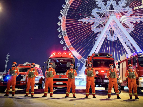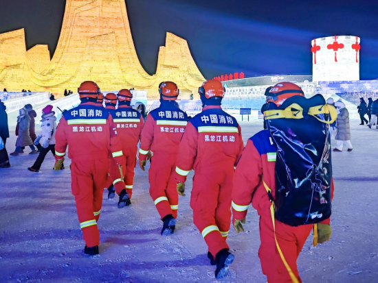 中新网黑龙江新闻12月31日电(王红彤)随着冰雪旅游季的持续升温,为守护冰雪旅游季安全,连日来,哈尔滨市森林消防支队的指战员身着橙色救援服,在零下28℃的严寒中携带担架、绳索等救援装备在哈尔滨冰雪大世界景区开展前置备勤任务,用坚守筑起冰雪旅游的安全防线,让寒冬里的冰雪盛宴更添暖意。