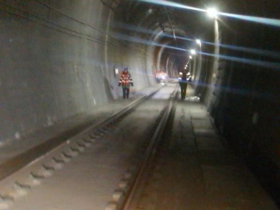 10点整,上行隧道检查告一段落,四人返回杜草隧道的临时休息室,匆匆用过自带的午餐并稍作休整。下午13:30,他们准时进入下行隧道,继续沿铁轨缓缓行进,一边用工具在壁面上仔细敲击,一边凝神辨听声响,以此研判隧道结构的安全状况。直到下午3点,全天的检查任务终于完成。走出隧道时,洞口的日光如同一道雪白的长帘,清晰地将内外划分成两个世界。