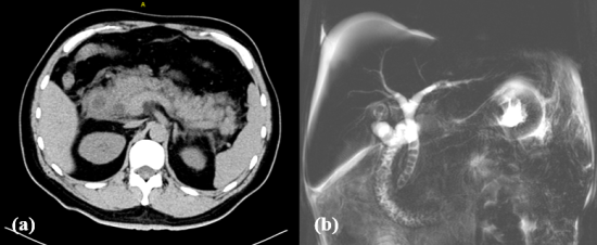 图1b MRCP示胆总管、肝总管及肝内胆管均扩张,且胆总管内满布结石呈“串珠样”