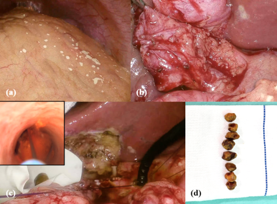 经过充分的术前准备,王刚教授带领成龙主治医师及苏铁、许信为医师,在薛东波主任的协助下,为患者成功进行了胆道镜下胆总管切开取石、T管引流术+LC。术中可见腹腔重度粘连、肠系膜及网膜满布皂化斑、腹腔内一定量腹水,胆管明显扩张。经过近2.5个小时的精细操作,胆总管内的8块结石全部顺利取出,全程出血不足30ml。术毕,患者返回普通病房继续治疗。