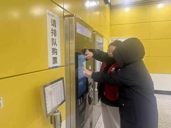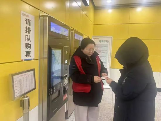 在进乡街地铁站,网格员化身“便民志愿者”,精准对接乘客急难愁盼。针对老年人不会操作自助售票机、外地游客不熟悉购票流程的问题,志愿者们手把手耐心指导,全程协助选择目的地、完成支付、取出车票,细致周到、不厌其烦;遇到携带大件行李的乘客,主动上前搭把手,协助搬运行李、引导至候车区域,用点滴行动化解出行不便,传递城市温情。