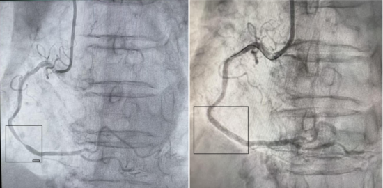 冠脉造影:右冠脉重度狭窄 右冠脉支架术后