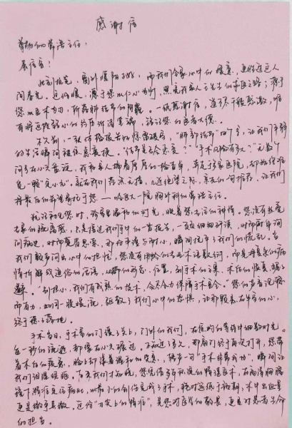 中新网黑龙江新闻2月10日电(刘璐)一张薄薄的粉色信纸,一行行工整的手写楷体,近日被郑重地送到哈尔滨医科大学附属第一医院胸外科主任常浩教授手中。这并非普通的信件,而是一位患者家属在亲人历经肺部结节手术并顺利康复后,用心写下的千言感激。