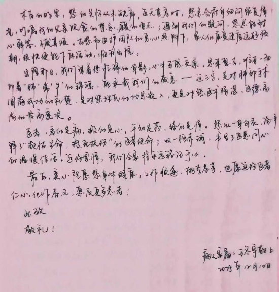 在信息飞速传递的今天,这封手写的纸质感谢信显得尤为厚重。它不同于即时的短信或网络留言,一笔一画都凝聚着患者家庭沉淀后的真挚情感。