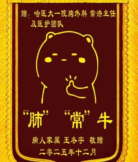 出院时,家属赠送了一面构思巧妙的锦旗,上书“肺常牛”。这三个字,既谐音“非常牛”,表达了对手术技艺的赞叹,又紧扣肺部手术主题,更巧妙嵌入了对常浩主任的敬意。家属在信中感慨:“医者,看的是病,救的是心,开的是药,给的是情。”