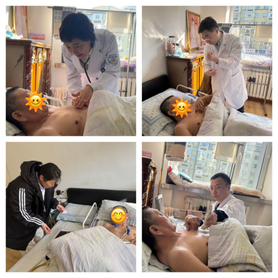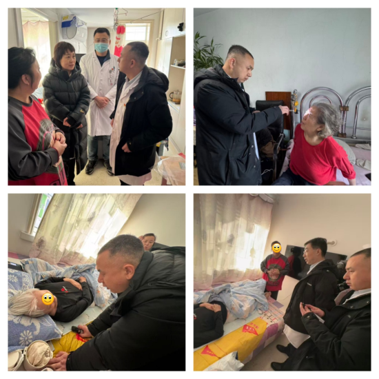 在张桂清老人家中,心血管内三科主任王爱华详细询问了患者病情及近期的用药情况和身体感受,嘱咐患者应定期服用心血管药物,如有不适情况可以随时拨打她的电话进行咨询;在患有颈椎病和腰椎间盘突出的韩茂仁老人家,骨外二疼痛科秦媛医生详细检查了患者的关节活动度,并现场教学,演示了一套简单易行的居家康复动作;神经内一科主任刘照寒则针对脑梗后长期卧床的单国志老人评估了其神经功能恢复情况,并对家属的护理要点进行了指导;眼科主任田立朋为视力模糊的朱凤昆和周殿英两位老人进行了眼底初步筛查,并给出了进一步检查的建议。