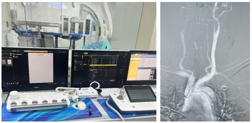 今年58岁患者刘女士(化姓)一年前因脑梗塞合并颅内动脉瘤入院,进行了脑动脉搭桥术。现术后一年需要进行全脑血管造影评估搭桥术后及颅内动脉瘤情况。然而,患者主动脉弓较为复杂,临床上称为Ⅲ型弓(一种血管开口角度刁钻的变异类型),传统人工操作下导管进入指定血管的难度大、耗时长,患者与医生暴露在X射线下的时间也随之延长。