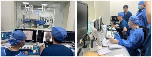 李永利教授带领团队正在远程操控导丝导管到达指定血管及位置,大大减少患者及医生接受辐射的时间。