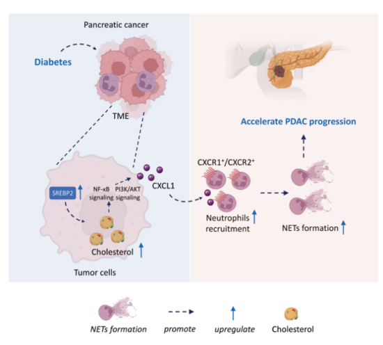 本研究成果,首次整合空间代谢组学与空间转录组学,在保留组织空间结构的基础上,系统解析了糖尿病背景下胰腺癌肿瘤微环境中细胞特异性代谢重编程与免疫反应之间的动态交互机制。机制研究发现,糖尿病状态下肿瘤细胞SREBP2介导的胆固醇生物合成增强,进而通过PI3K/AKT与NF-κB信号通路上调CXCL1分泌,并以CXCR1/CXCR2依赖方式招募中性粒细胞诱导NETs形成,最终驱动胰腺癌进展。此外,研究团队进一步通过血清代谢组学与组织芯片分析证实,糖尿病胰腺癌患者CXCL1+肿瘤细胞与CXCR2+中性粒细胞空间临近,且血清胆固醇与CXCL1水平可作为胰腺癌患者不良预后的潜在标志物。本研究阐释了糖尿病促进胰腺癌进展的时空动态机制,深化了对糖尿病胰腺癌发病机理的认识,为该类患者的精准治疗开辟新途径。