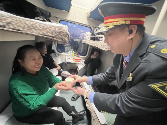 巡视至9车时,张磊发现一位老年旅客坐在卧铺边座上,不远处有一台轮椅折叠收着。原来,这位老人刚从北京出院,家里人轮番上阵才抢到一张回牡丹江的中铺,她不好意思麻烦别人,想等挺不住再上去。