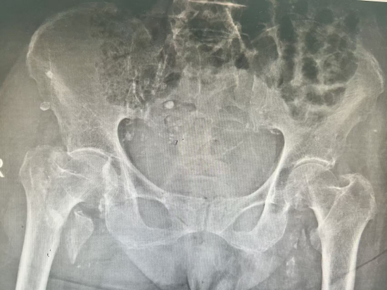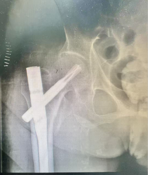 图1:入院时骨盆平片显示患者右侧股骨转子间骨折,骨质疏松