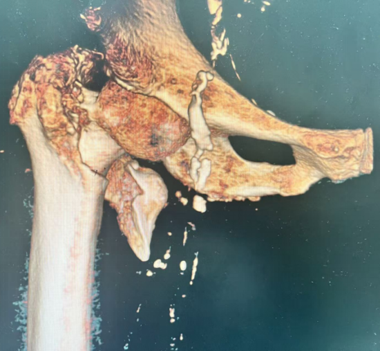 图2:三维重建 CT显示患者右侧股骨转子间骨折,骨折近端有分离移位,远端存在短缩嵌插,阴性支撑,小转子分离移位明显,股骨近端颈干角变小,髋内翻畸形