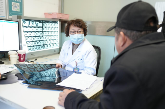 血液内科范圣瑾教授在诊室内,向一名患者家属耐心介绍腰穿检查的特点和安全性。