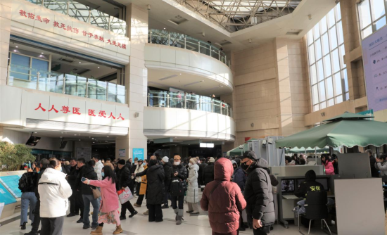 哈医大一院安检员紧守“入口关”,认真指导患者有序排队通过安检通道,他们每天不定时巡视诊区,确保院区秩序。