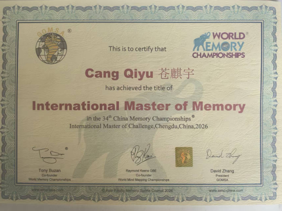 走出国门,苍麒宇依旧亮眼。2026年1月的第六届亚太学生记忆锦标赛亚太总决赛,他摘得6金3银,成为儿童组和全场双料亚太总冠军;此次成都的大师挑战赛,他更是突破自我,通关被称为记忆大师认证核心关卡的“铁三项”,成功加冕国际大师。