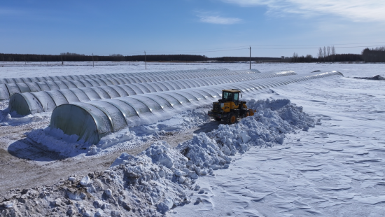 在同江市向阳镇勤俭村,随着气温逐步回升,农户们趁着晴好天气,采取人机结合、户间合作的方式,加快清除育苗大棚及周边的积雪。大型铲车正在高效清理田间积雪,在机械难以覆盖的大棚边角、缝隙等区域,农户们挥锹铲雪、干劲十足,不放过任何一处积雪,确保大棚骨架不受积雪压迫,为后续的扣棚和育苗工作创造良好条件。