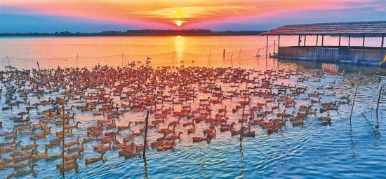 立秋时节,3万只金定麻鸭在富裕县龙安桥镇小河东村的龙腾湖面上嘎嘎嘎地追逐嬉闹,灿烂的羽毛在夕阳的余辉下,像浮着一簇簇花环,麻鸭戏水,美景如画。