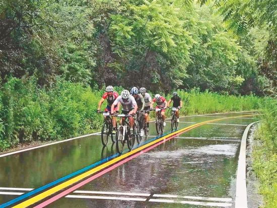 7月16日,在集贤县七星山国家森林公园,2023集贤县七星山山地自行车邀请赛鸣枪开赛。细雨蒙蒙中,来自全国的300名自行车爱好者,你追我赶,尽享速度与激情。一路上,自行车流与彩虹赛道和沿途自然风光相得益彰,形成一道独特的风景。