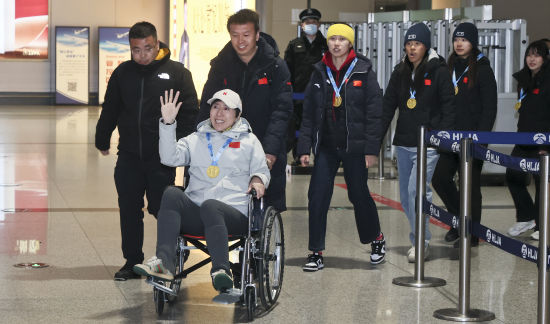 在哈尔滨太平国际机场航站楼出站口,省雪上训练中心、省田径水上运动训练中心主要领导为教练员和运动员献上了欢迎勇士归家的花束。