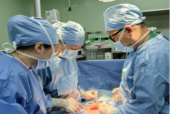 10月31日,张女士接受剖宫产手术。随着新生儿响亮的啼哭声响起,手术室内洋溢着新生的喜悦,张女士激动不已。随后,方磊副主任医师进一步探查左侧卵巢囊肿,见清亮粘稠囊液涌出,囊液量约3000ml,左侧巨大卵巢囊肿与子宫后壁及直肠粘连固定。手术团队精细分离粘连组织,完整剥除囊壁,成功保留左侧卵巢组织并重塑其形态。术中快速冰冻病理检查回报为左卵巢纤维瘤。得知病理结果为良性,张女士悬着的心终于放下。